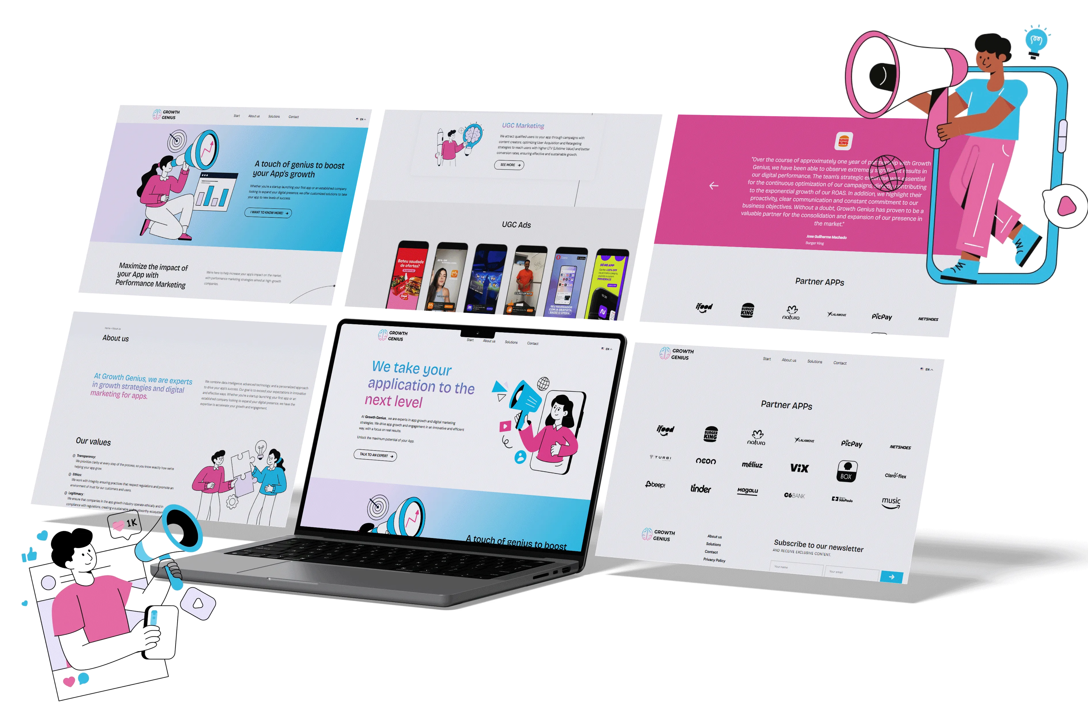 Direção criativa, produção de conteúdo e desenvolvimento do site institucional da Growth Genius, marca especializada em estratégias de crescimento e marketing digital para aplicativos.