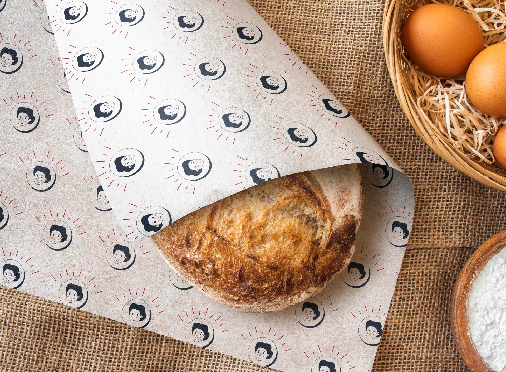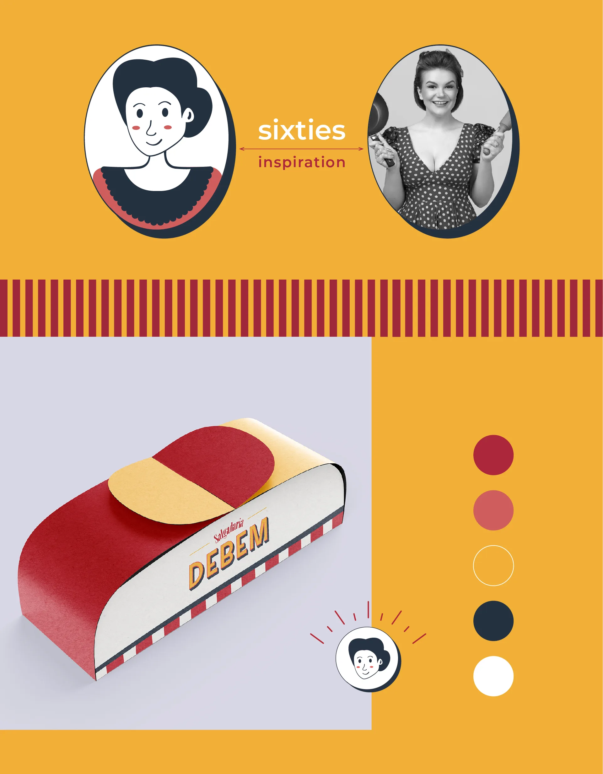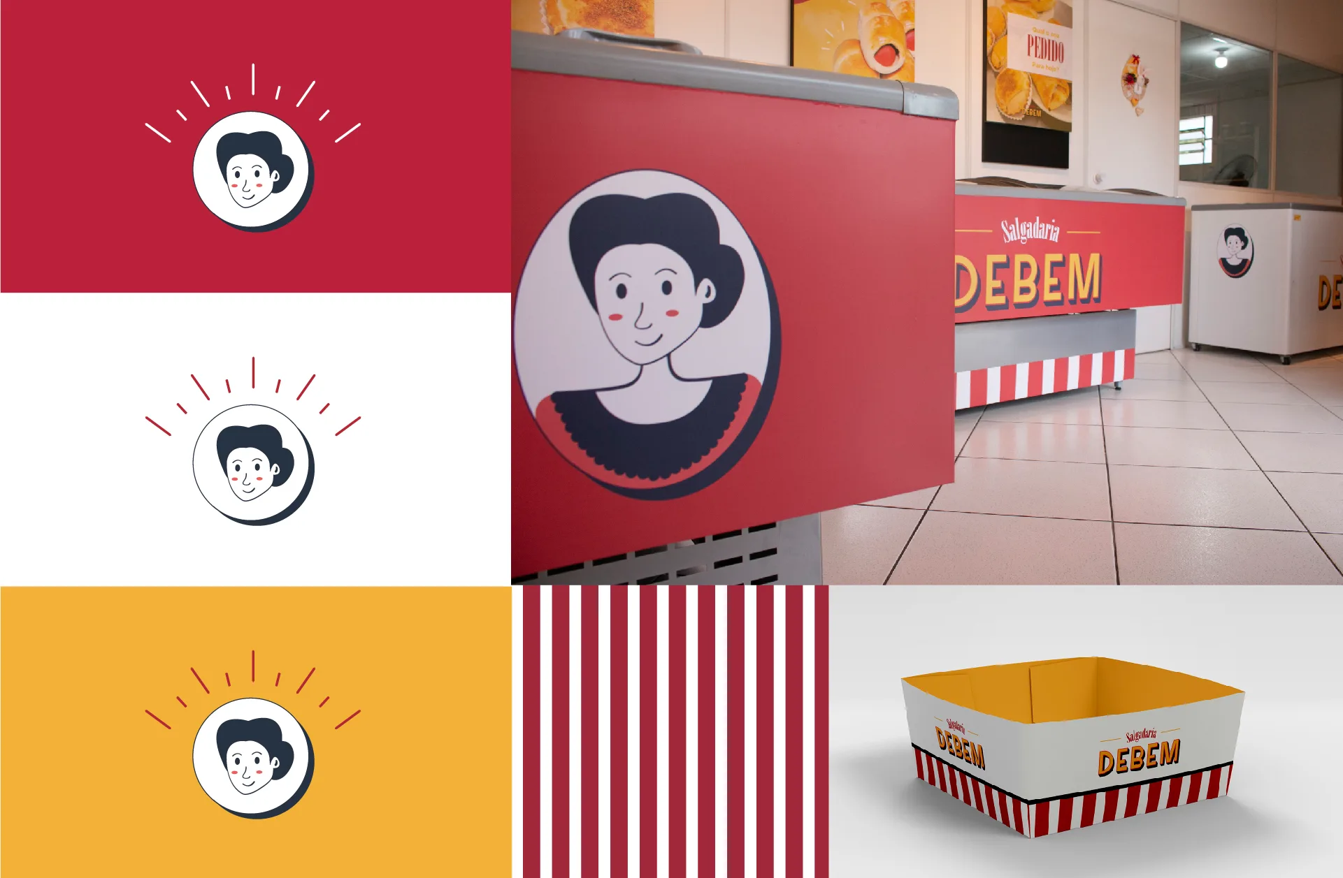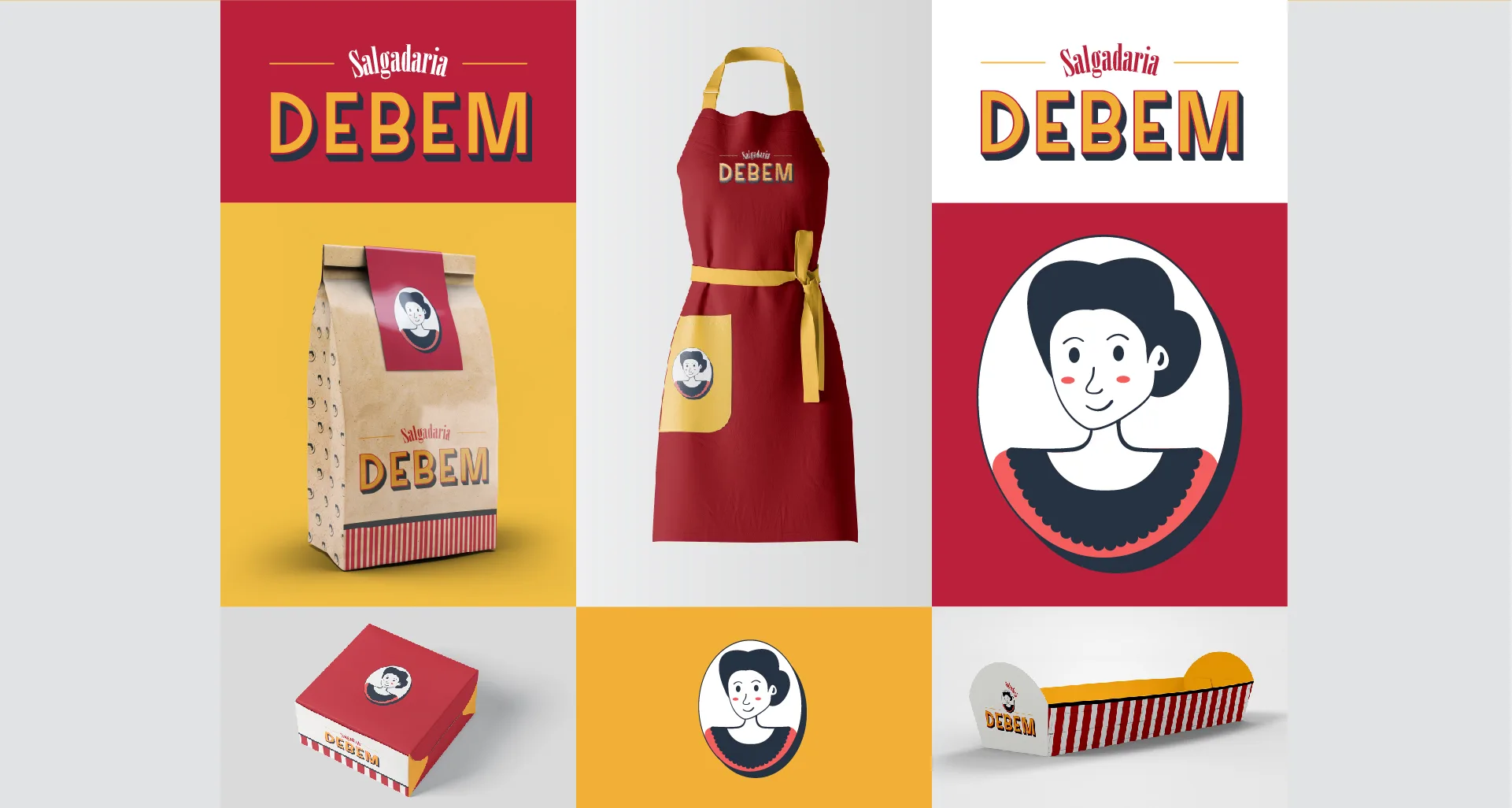 O nome e a identidade Debem Salgadaria foram inspirados na proprietária. Criou-se uma persona feminina, dentro da estética dos anos 60, com olhar doce e coque baixo, que prepara alimentos com muito amor e dedicação. O lettering retoma o vintage, completando a composição.