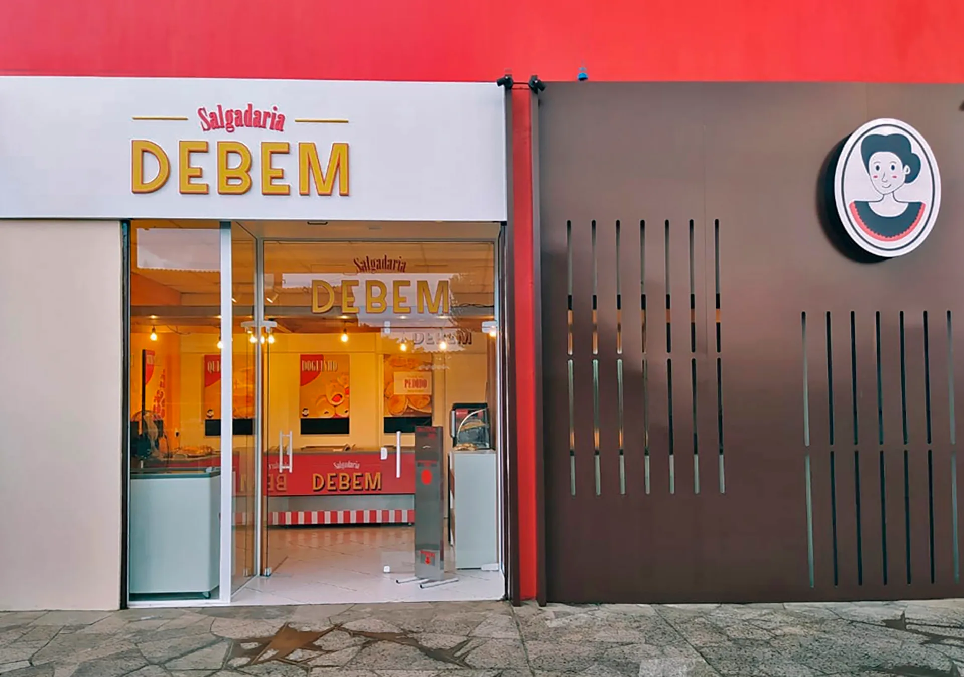 O projeto completo abrangeu desde a criação do nome, desenho da marca, identidade aplicada a diversos pontos de contato com o cliente, assim a sinalização visual externa e o projeto total do ambiente interno da salgadaria.